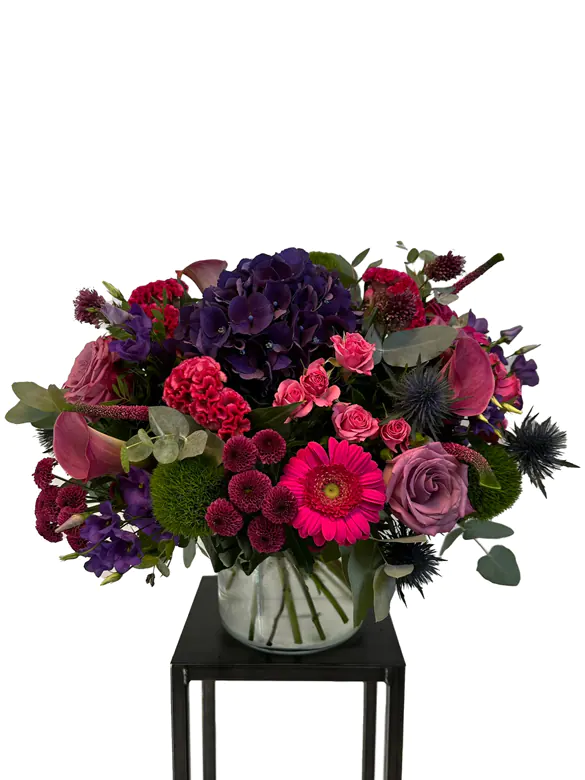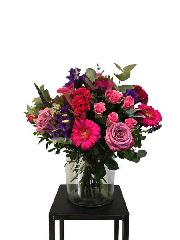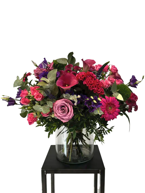 Luxe, sprekend en stijlvol Maak een statement met deze diepe, harde roze kleuren. Een pallet van fuchsia en magenta met een luxe diversiteit aan bloemen zoals rozen en lisianthus. Een boeket dat klasse en passie uitstraalt.